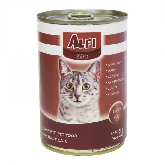 Az Alfi Cat konzerv máj macska nedvestáp teljes értékű állateledel felnőtt macskák számára májjal.