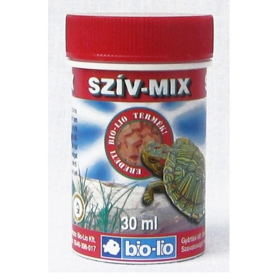 BIO-LIO SZÍV-MIX. Liofilizált marhaszív teknősök részére. A feldolgozás során a beltartalmi érték nem változik tápértéke az élőével megegyezik. Rendszeres etetésével a teknősök megőrzik vitalitásukat. Kerülni kell az egyoldalú táplálást kiegészítésképpen más természetes eleség: pl. fehérhal alkalmazása javasolt. Egyszerre csak annyi eleséget kell az terrárium vizébe szórni amennyit a teknős / teknősök maradéktalanul elfogyasztanak. Tartósítószert nem tartalmaz. Beltartalmi érték: - Szárazanyag: 95 % - Nyersfehérje minimum: 75 % - Nyerszsír maximum: 8 %