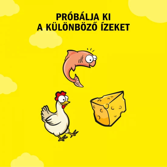Összetevők: Válogatott gabonafélék, Hús és állati származékok, Olajok és zsírok, Tej és tejszármazékok (ebből 4% sajt), Hal és halszármazékok (ebből 4% lazac), ásványi anyagok.
