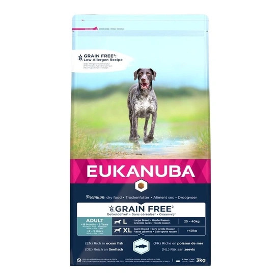 Az Eukanuba Grain Free* nagytestű felnőtt kutyáknak szánt tápja allergénszegély receptúra alapján készül, gondosan kerülve a leggyakoribb allergéneket. A gondoskodó összetétel gluténmentes* édesburgonyát tartalmaz, amely a rostok, esszenciális vitaminok és antioxidánsok természetes forrása. A csirkehúsmentes receptúra kizárólag halat tartalmaz állati fehérjeforrásként. A tengeri halakban és frissen fagyasztott lazacban gazdag eledel ellátja kutyáját az erős és sovány izomzat felépítéséhez és megőrzéséhez szükséges állati fehérjével. A táp prebiotikus frukto-oligoszacharidokkal és cukorrépapéppel támogatja az egészséges emésztést. A borsó és az édesburgonya alternatív szénhidrátforrásként szolgál. Emellett a természetes omega-6 és omega-3 zsírsavforrások elősegítik az egészséges bőr és fényes szőrzet megőrzését, a kalcium és a glukozamin pedig támogatja a csontok és az ízületek egészségét. A felnőtt, nagytestű kutyák igényeire szabott receptúránk ráadásul különleges formájú falatkáinak és az egyedülálló DentaDefense technológiának köszönhetően kutyája fogainak tisztaságát és egészségét is megőrzi. A felnőtt, nagytestű kutyáknak szánt Eukanuba Grain Free* 100%-ban teljes értékű, kiegyensúlyozott eledel, amely gondoskodik kedvence általános jóllétéről.