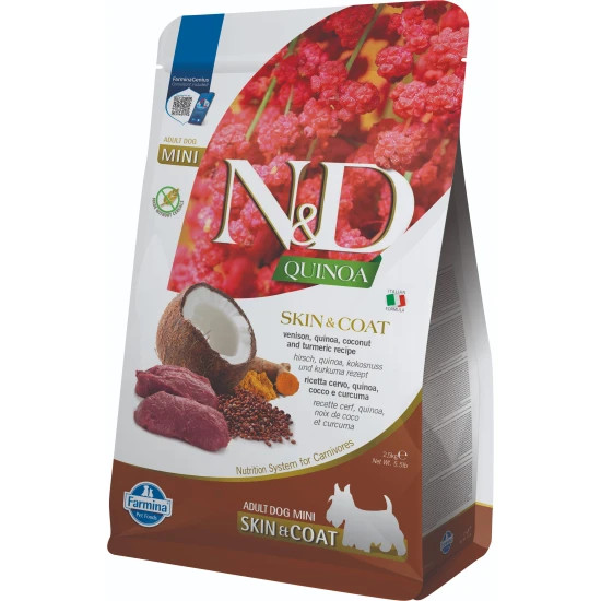 N D Quinoa Skin Coat egy teljes értékű diétás eledel felnőtt kutyák számára valamely összetevővel vagy tápanyaggal szembeni érzékenység csökkentésére.
