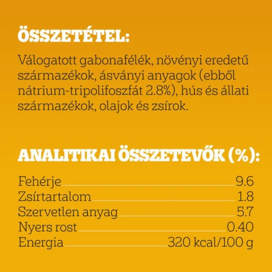 Válogatott gabonafélék, Növényi eredetű származékok, Hús és állati származékok, Ásványi anyagok (ebből 2,5% nárium-tripolifoszfát), Növényi fehérje kivonatok, Olajok és zsírok
