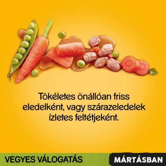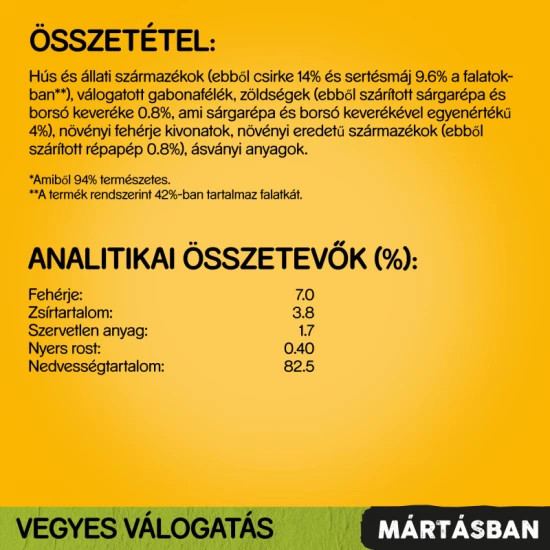 - Csirkével és zöldségekkel: hús és állati származékok (39%, ebből 4% csirke), zöldségek (4% sárgarépa és zöldborsó), válogatott gabonafélék, ásványi anyagok, növényi eredetű származékok (ebből 0,5% szárított répapép), olajok és zsírok (ebből 0,5% napraforgóolaj), növényi fehérje kivonatok