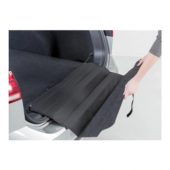 Rugalmas szalagokkal és akasztókkal a könnyű rögzítés érdekében az autó csomagtartójában lévő padlókampókhoz.