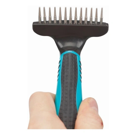 Alkalmas a hosszú szőrű kedvenceknek, a felső és alsó szőrök eltávolítására. A fésű fogai forognak és a fogak végei kissé elvékonyítottak, így ideális a szőrbontáshoz is, valamint növelik a hatékonyságot. A fogak hossza 2cm. Anyaga: Fém, műanyag és gumi markolattal. Mérete: 7 x 14 cm. Ne hagyja kedvencét felügyelet nélkül a termékkel. Származási hely: a csomagolásra nyomtatva. Forgalmazza: Alpha-Vet Kft. 1194 Budapest Hofherr A. u. 42. vevoszolgalatbp@alpha-vet.hu