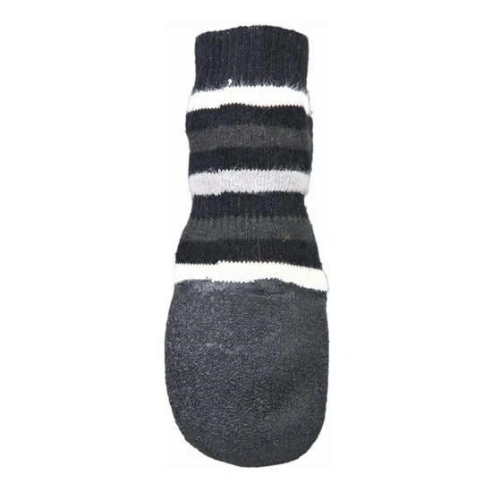 A Trixie csúszásgátló védő zokni segíti a sérült mancsok gyógyulási folyamatát és védi a sérülésektől a tappancsokat. Erős csúszásmentes aljú, így alkalmas idős kutyák számára, vagy lakásban tartott kutyáknál a parketta védelmére. A zokni pamut és elasztán anyaga jól szellőzik. Színe: szürke, fekete. A csomag tartalma: 1 pár zokni. Méret: L. Golden retrievernek, vagy hasonló testméretű kutyáknak ajánlott.
