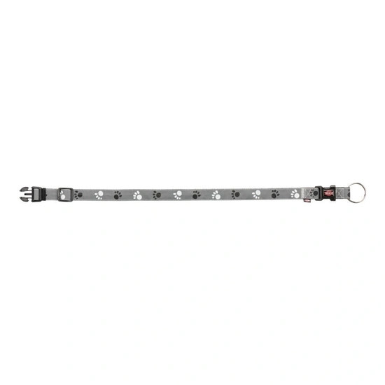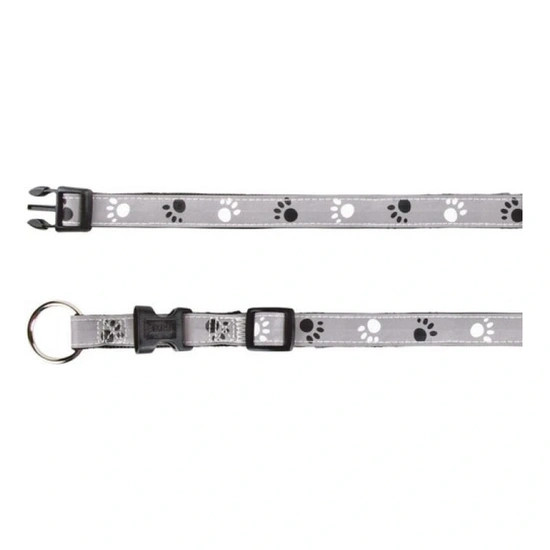 A Trixie ezüst színű, fényvisszaverő nyakörvével biztonságosabb a sötétben, vagy rossz látási viszonyok között történő kutyasétáltatás. Az állítható nylon nyakörvön fényvisszaverő tappancs lenyomatok biztosítják a jobb láthatóságot, mivel felülete visszaveri az autófényszórók, vagy az utcai lámpákról a felületére vetődő fényét. Állítható méret: 40-65cm/15mm, Szín: szürke-fekete